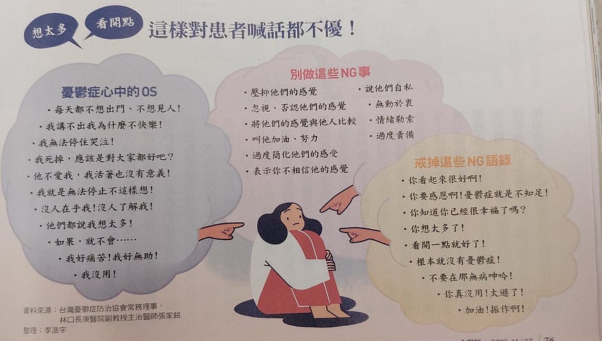 很多人面對憂鬱症或剛經歷重大創傷的親友,往往不知該如何應對,傳統那些所謂安慰人的話,例如:不要想太多、你其實已經很幸福了、加油…等,此時不但幫不上忙,更如同提油滅火,反而令需要協助的親友更不敢開口求助,只能一個人孤單面對,病症反而加劇。(請參見下圖,來源:今週刊2022.11.07~11.13)