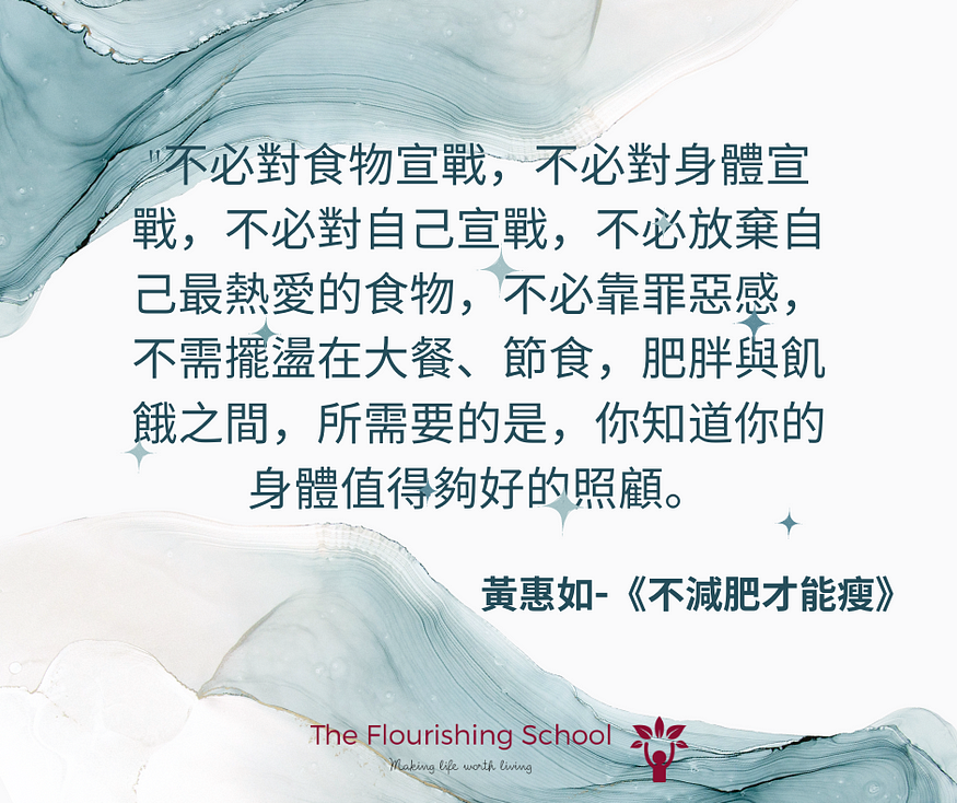不必對食物宣戰,不必對身體宣戰,不必對自己宣戰,不必放棄自己最熱愛的食物,不必靠罪惡感,不需擺盪在大餐、節食,肥胖與飢餓之間,所需要的是,你知道你的身體值得夠好的照顧。